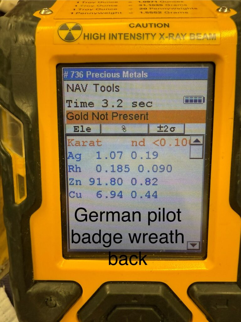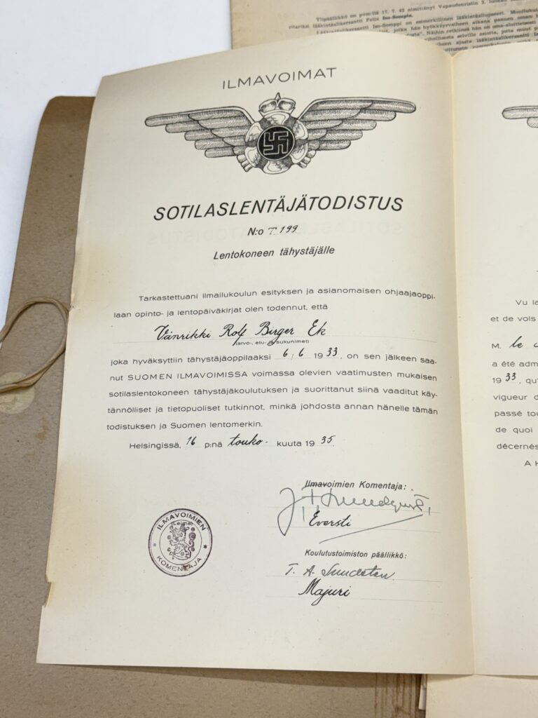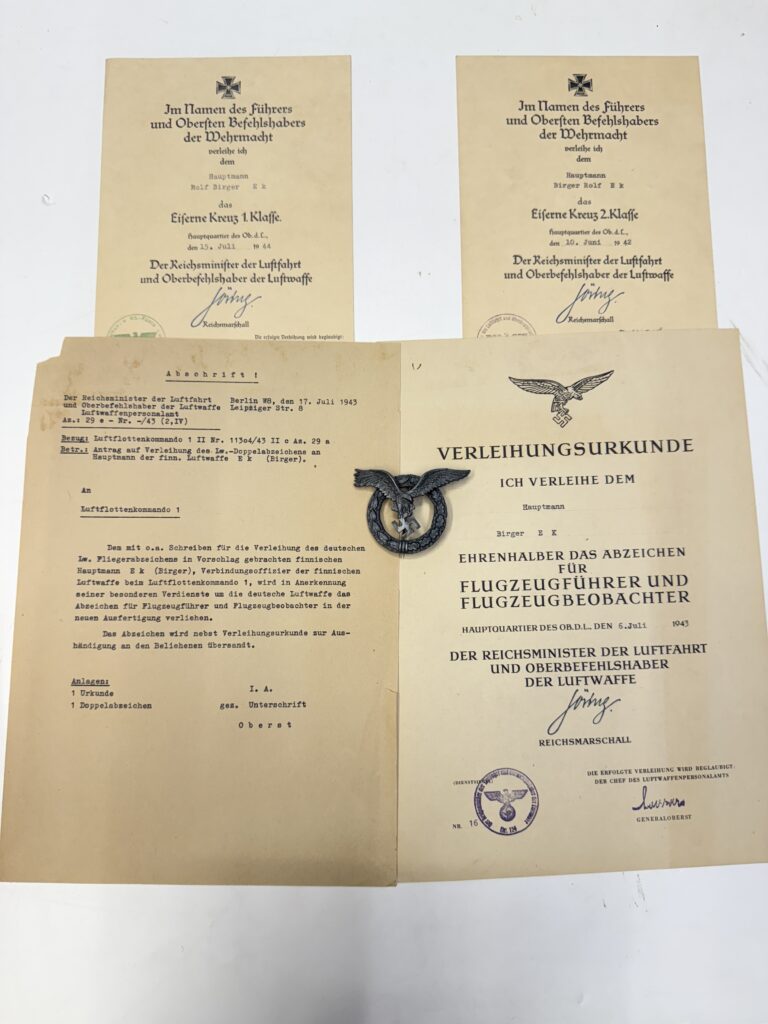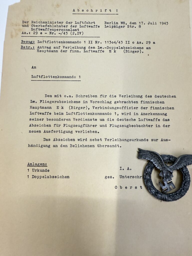 Kuvissa näkyy hänen saksalaisilta saatu lentomerkki sekä siihen liittyviä lisätietoja. Lentomerkki on erittäin harvinaista ns. ”pyöreä kranssi” mallia. Saadun tiedon mukaan näitä pyöreitä merkkejä ei ole näkynyt aikalaisvalokuvissa ollenkaan. Näinollen näitä on jopa epäilty väärennöksiksi. Tässä voimme valokuvan kautta todentaa, että Birger Ekin merkki on alunperin ollut pyöreätä mallia (tavanomainen merkki on soikea). Birger Ek toimi vuonna 1943 Suomen yhteysupseerina Baltiassa sijoitetussa Luftflottenkommando 1:ssä. Tästä ajasta hän on saanut hopeisen tupakkarasian lahjaksi. Lisäksi ajalta löytyy huomattava määrä valokuvia, joiden kuvat esitetään alempana tällä sivulla. Merkin myöntökirja sekä liitekirje kuuluu mukaan. Liitekirjeessä on mielenkiintoinen maininta ”…in der neuen ausfertigung verliehen”, eli myönnetään uudessa ulkomuodossa. Tämä saattaa tarkoittaa juuri pyöreätä mallia. Koska pyöreitä merkkejä esiintyy erittäin harvoin, on mahdollista että nämä ovat ns. Honoris Causa merkkejä, joita myönnettiin ikäänkuin kunnianosoituksena. Kuvat röntgenanalysaattorin lukemista antaa ymmärtää, vaikkakin merkki on säilytyksessä kovasti tummunut, että etupuolen kranssissa ja kotkassa esintyy kultaa ja hopeata, kuten kuuluukin. Merkissä ei ole valmistajaleimoja.