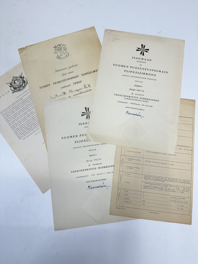 Birger Ekin ja hänen vaimonsa kunniamerkkirivat sekä Saksan 1-lk:n rautaristi. Kaikkiin Birger Ekin kunniamerkkeihin löytyy myös luovutuskirjat. Kuvassa näkyy myös miniatyyriripa sekä RUK-risti. Kunniamerkkirivasta löytyy seuraavat merkit: VR 3 1941 mk tl, VR 3 1941 mk, VR 4 1939, Ts Mm, Js Mm, Talvisodan Tolvajärvi risti, Jatkosodan Ilmavoimien risti, Saksan Rautaristi 2lk, Ruotsin miekkaritarikunnan ritariristi (18k kultaa). Irrallisena Päämajan risti sekä Saksan Rautaristi 1-lk.