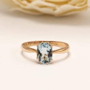 14k keltakullasta valmistettu sormus, jossa violetti kivi (korukivi/ synteettinen). Sormus on valmistettu vuonna 1999.